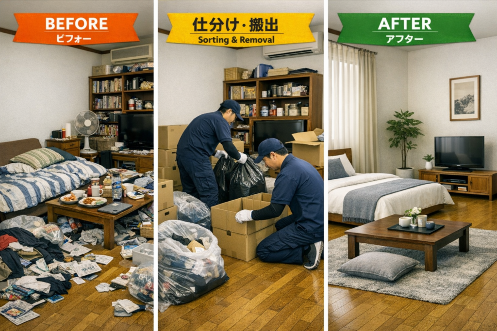 遺品整理とは、亡くなった方が残した持ち物(遺品)生活用品・家具・思い出の品などを整理し、必要なものと不要を仕分けて、住まいを整える作業のことです。通帳・印鑑・権利書・重要書類・写真・手紙などの貴重品を丁寧に探索し、ご遺族様にお渡しするサービスです(現地での立会は喜んでお受け致します)